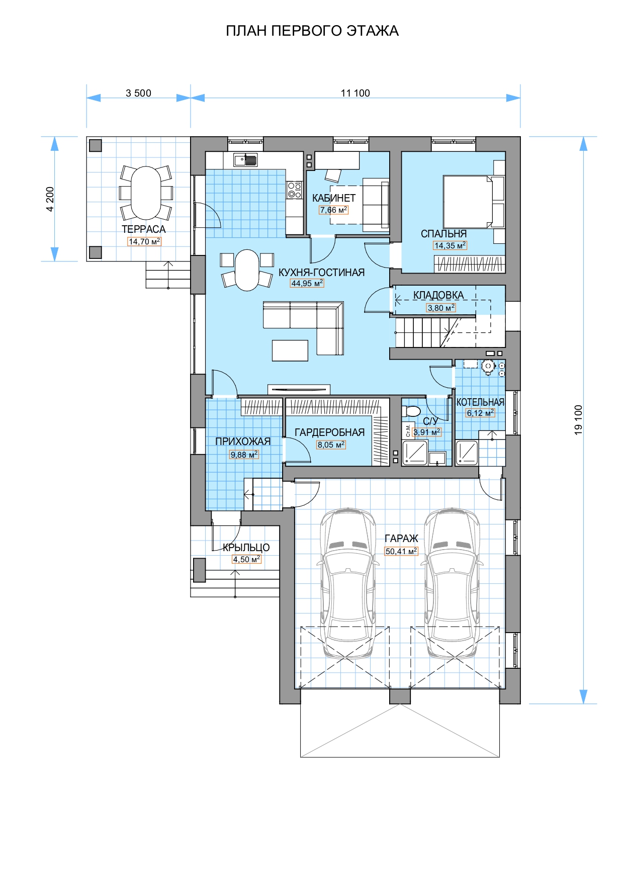 На первом этаже располагается гараж, из которого можно попасть как в дом, так и сразу в котельную. Такое решение особенно удобно для инженерных служб — оборудование можно обслужить, не заходя в жилые помещения. Кроме того, здесь предусмотрены гостевая комната, кабинет, санузел, а также просторная кухня, совмещённая с гостиной. Гостиная включает диванную зону с большим витражным окном, открывающим вид на сад. Из кухни традиционно предусмотрен выход на небольшую террасу, где можно проводить семейные завтраки или вечера на свежем воздухе.
