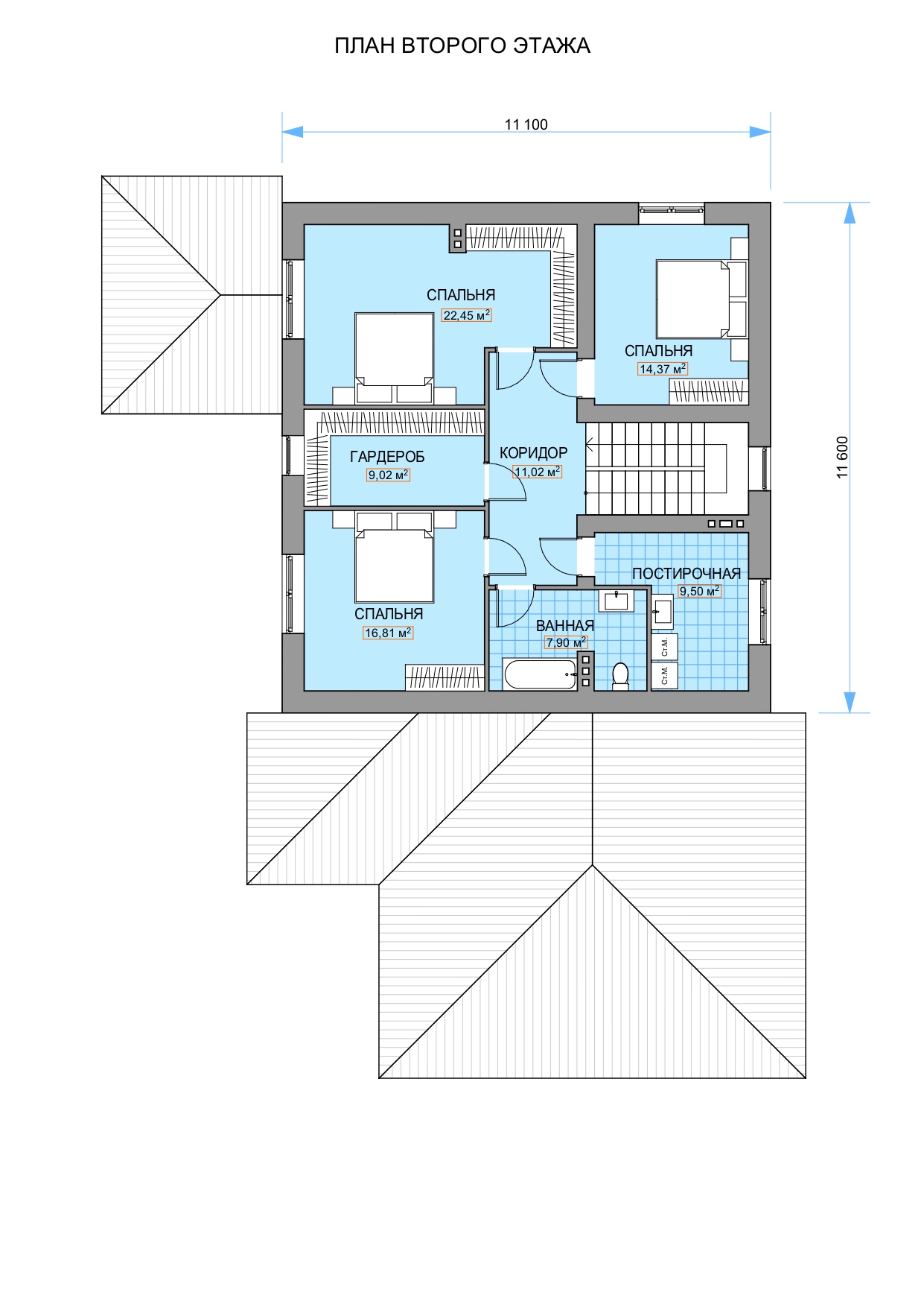 Второй этаж выполнен в классической компоновке: мастер-спальня со своим выходом в большую гардеробную, две детские комнаты, вместительная ванная и отдельная постирочная. Такое решение обеспечивает удобство повседневной жизни: у родителей есть собственная приватная зона, а у детей — просторные комнаты, где можно разместить не только спальные места, но и рабочие зоны или уголки для игр.